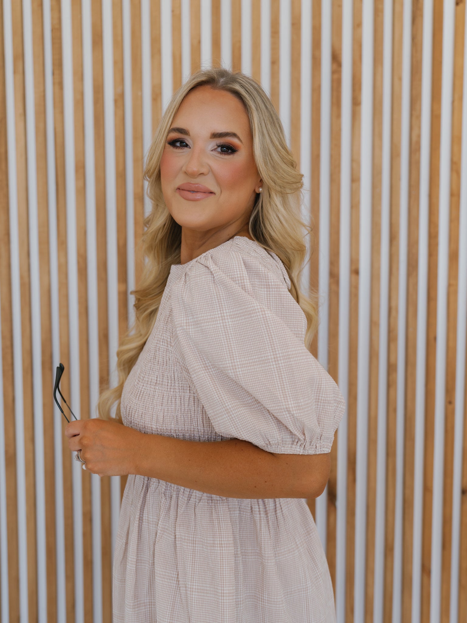 Get ready to have all eyes on you in the "Annika Mini Dress!" The most stunning fall ensemble, this beige mini dress boasts short balloon sleeves, a fully smocked bust and back, and a flowy skirt. This dress would make the perfect pumpkin patch, date night, or brunch outfit!